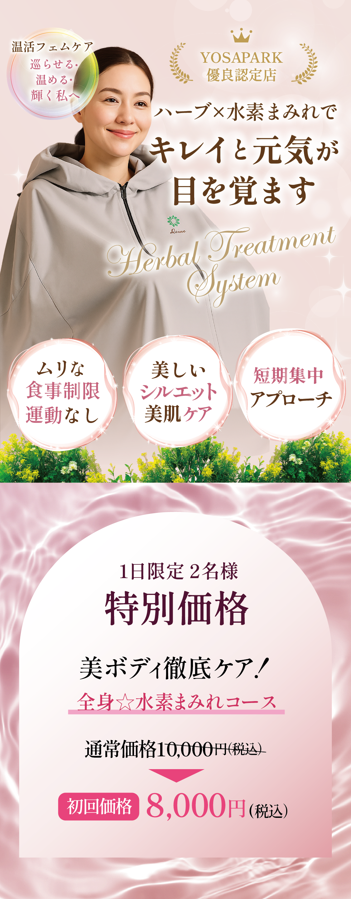 水素水と厳選されたハーブを使用した、温熱美容ケアです。